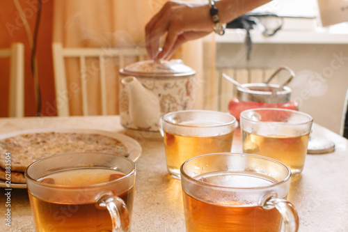Woman pours hot tea from ceramic teapot into transparent glass cups