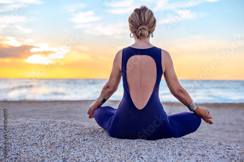 Woman practicing yoga in a sea background at sunrise. Meditation.