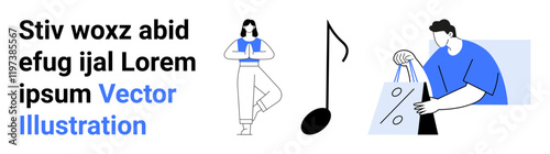 Woman practicing yoga, large musical note, and man with shopping bags. Ideal for wellness, leisure, music, shopping, productivity recreation and lifestyle. Landing page