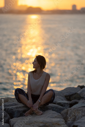 Woman practicing yoga meditation at sunrise. Morning yoga on the beach or coast of sea urban city background.