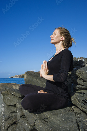 Woman practicing yoga on rocky coast of Maui, Hawaii.