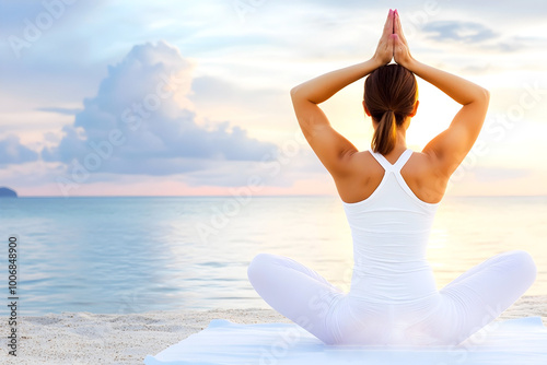 Woman practicing yoga on the beach at sunrise, sitting in a lotus position with hands raised above her head, facing the calm ocean