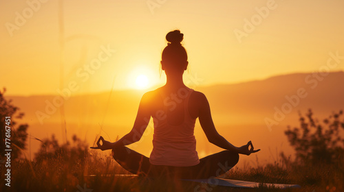 Woman practicing yoga, sitting in lotus position. Serenity, meditation, Zen. Yoga in nature. Yoga practice at sunset.