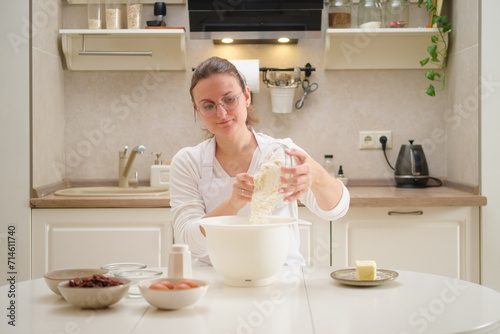 Woman preparing dough in the kitchen at home. Healthy food concept. Process of cooking pecan pie in home kitchen for American Thanksgiving Day.