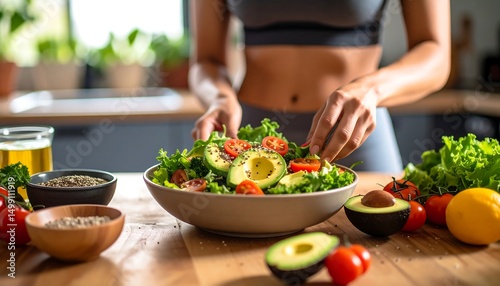 Woman preparing fresh vegetable salad with avocado and tomatoes in a modern kitchen environment with natural lighting. Focus on healthy eating and lifestyle choices