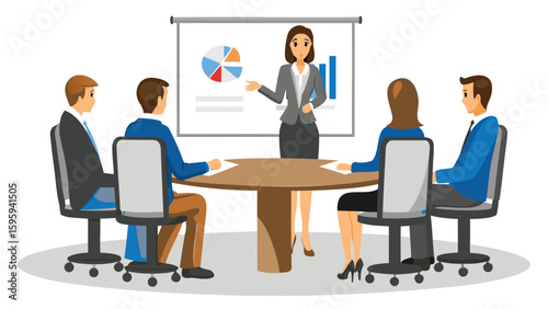 Woman presenting a pie chart and bar graph to a group of people around a table in a meeting room