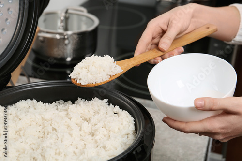 Woman putting boiled rice into bowl from cooker in kitchen, closeup