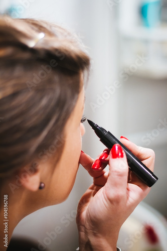 Woman putting on makeup in the mirror