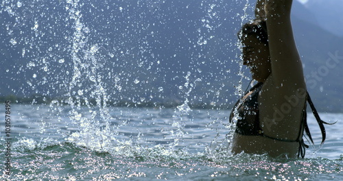 Woman raising arms and splashing water in slow-motion at 800 fps, showcasing the vibrant motion and fun in a serene lake environment