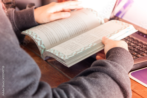 Woman reading book on work station