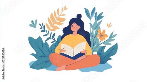 Woman Reading Book Surrounded by Flowers Peaceful Nature Illustration