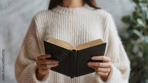 Woman reading constitution book for International Democracy Day, knowledge and rights concept.
