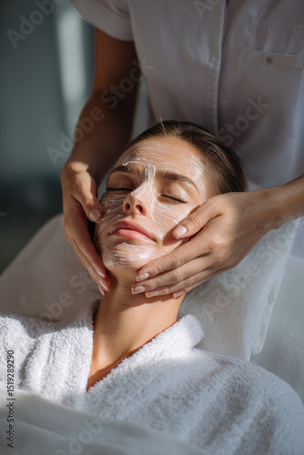 Woman receiving bio microneedling spicule mask treatment cosmetologist applying natural skin rejuvenation therapy, Selective Focus..