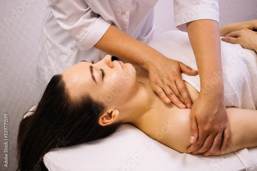 Woman receiving facial massage in beauty salon.Beauty and skincare concept with a beautiful woman. Middle aged female relaxed with massage for facial lifting
