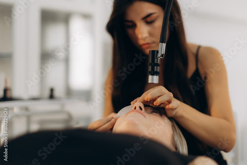 Woman receiving led eyelash extensions treatment