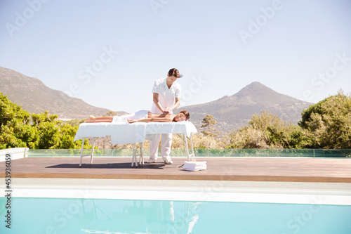 Woman receiving massage poolside at spa