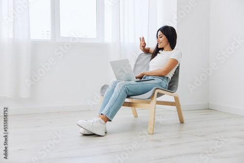 Woman relaxing at home and sipping her hands sitting in a chair with her laptop, lifestyle homemade spirits. Mockup, free copy space