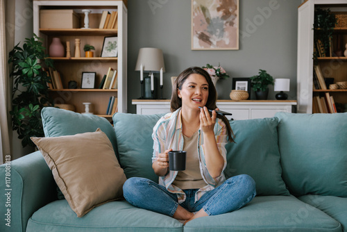 Woman Relaxing on Sofa with Coffee and Smartphone at Home