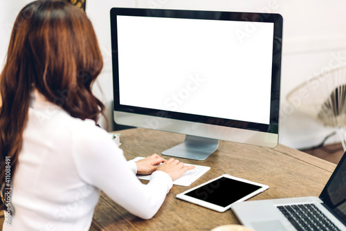 Woman relaxing using technology of desktop computer with white mockup blank screens on the table at home.Communication and technology concept