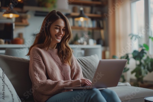 Woman Relaxing with Laptop in Comfortable Home Setting