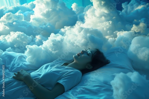 Woman resting in bed struggling with insomnia under soft moonlight.