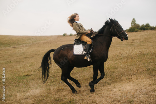 Woman Riding Black Horse in Open Field on a Sunny Day