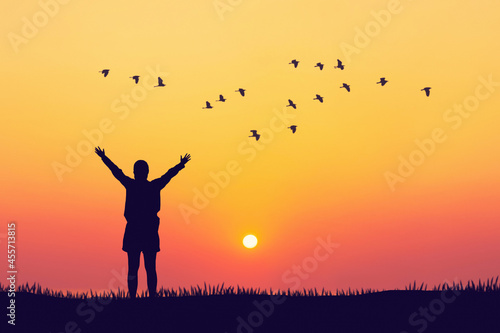 Woman rising hands and birds flying on sunset sky at nature field abstract background. Freedom feel good and travel adventure concept.