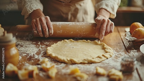 Woman Rolling Out Dough for a Pie on a Wooden Countertop