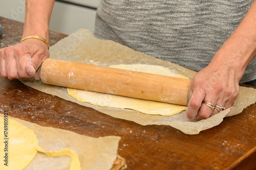 Woman rolling puff pastry for cake layers at home kitchen