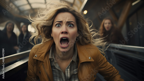 Woman running down stairs in subway station screaming. Concept of Panic or Distress in Public Space, Emergency Situation in Subway, Fear or Alarm in Underground Space.