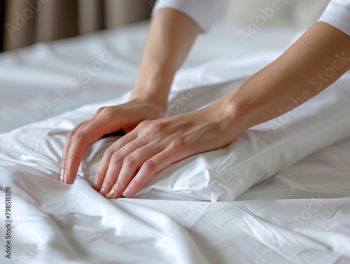 Woman s hands putting white fitted sheet on mattress in close up detail for bedding decor