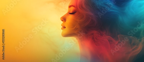 Woman s head fading into a rainbow flow, with soft gradient colors and a surreal ambiance, perfect for abstract and experimental art