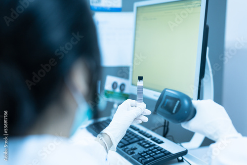 Woman scientist hand holding test tube barcode and scanner for automatic analysis machine in laboratory.Biologist working in modern laboratory with technological equipment.