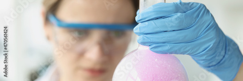 Woman scientist holding flask with purple liquid with foam in laboratory