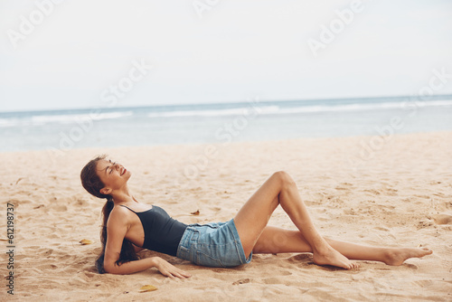 woman sea nature smile sand vacation sitting freedom caucasian beach travel