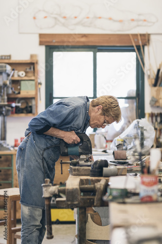 Woman senior artist cutting wood in a workshop