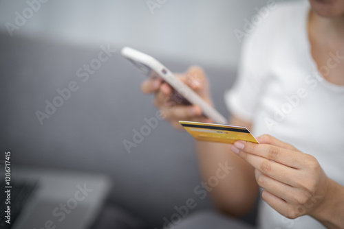 Woman shopping on laptop holding credit card for Internet online e-commerce shopping spending money Online shopping Mobile phone laptop technology