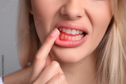 Woman showing inflamed gum on grey background closeup, Closeup of Woman with Inflamed Gum on Grey Background, Signs and Treatment, Understanding Gum Inflammation, Closeup of Woman Showing Symptoms on