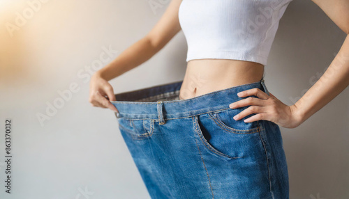 woman shows off her weight loss by holding out her oversized jeans, symbolizing transformation and achievement. Her confident smile reflects success and determination in achieving her fitness goals