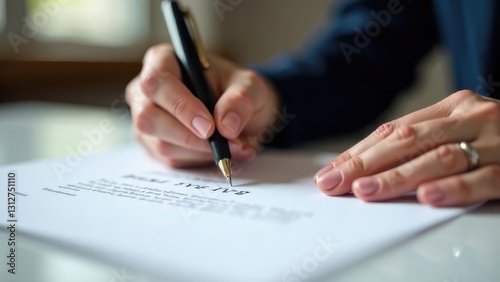 Woman signing a legal document with a pen. Concept of: Agreement signing.