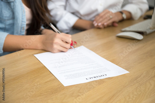 Woman signing business contract, female hand putting written signature on legal document in lawyers office, businesswoman making agreement, taking bank loan or insurance concept, close up view