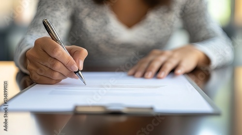Woman signing contract document with pen on clipboard business agreement legal paper paperwork concept writing