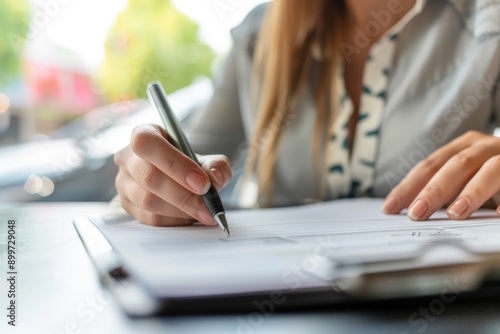 Woman signing paperwork for car purchase, illustrating transaction and ownership transfer