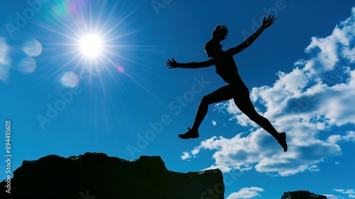 Woman silhouette mid-jump between two rocks against bright sky image. Boldness, freedom and adventure photography scene wallpaper. Extreme courage concept photorealistic photo