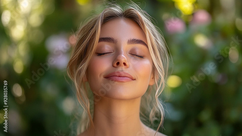 woman sits amid vibrant greenery, eyes closed, breathing deeply, embodying tranquility and harmony with nature. The scene captures introspection, peace, and a profound bond with the earth