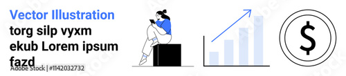 Woman sitting and working on tablet, growth chart with upward arrow, dollar sign in circle. Ideal for business strategy, financial analysis, economic growth, digital marketing, technology use