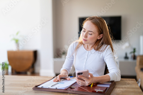 Woman sitting at a table looking at her phone while reviewing documents in a modern home office during the afternoon