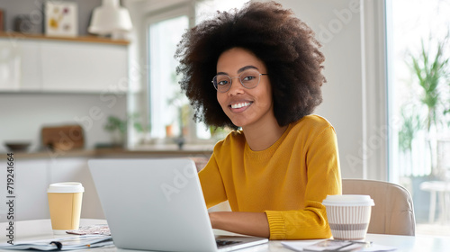 Woman Sitting at Table With Laptop, Working and Using Technology. Generative AI.