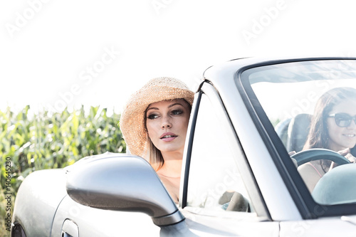 Woman sitting in convertible with female friend on sunny day