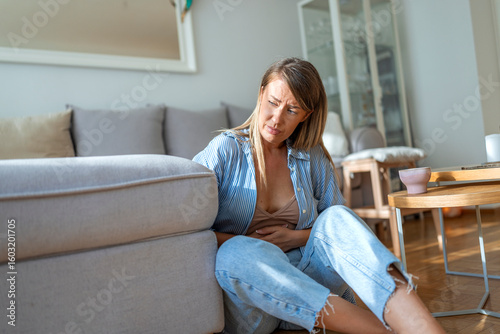 Woman Sitting on Floor Experiencing Discomfort at Home Living Room